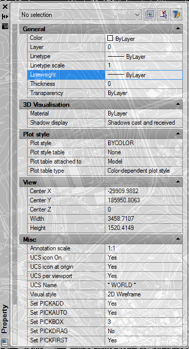 Nel Properties panel, si possono cambiare Layer, Color, Thickness, Lineweight, Linetype, Linetype Scale, e Print Style (se si usano le tabelle print style tables) campi che afferiscono a tutte le entita' selezionate. Per cambiare la proprieta' di un singola entita' nel selection set, scegli l'entita' dalla lista all'inizio del Properties panel. L'utente potra' selezionare le entita' da cambiare usando il metodo di selezione a video. Inoltre , IntelliCAD ha l'opzione di controllo Properties Panel window transparency.