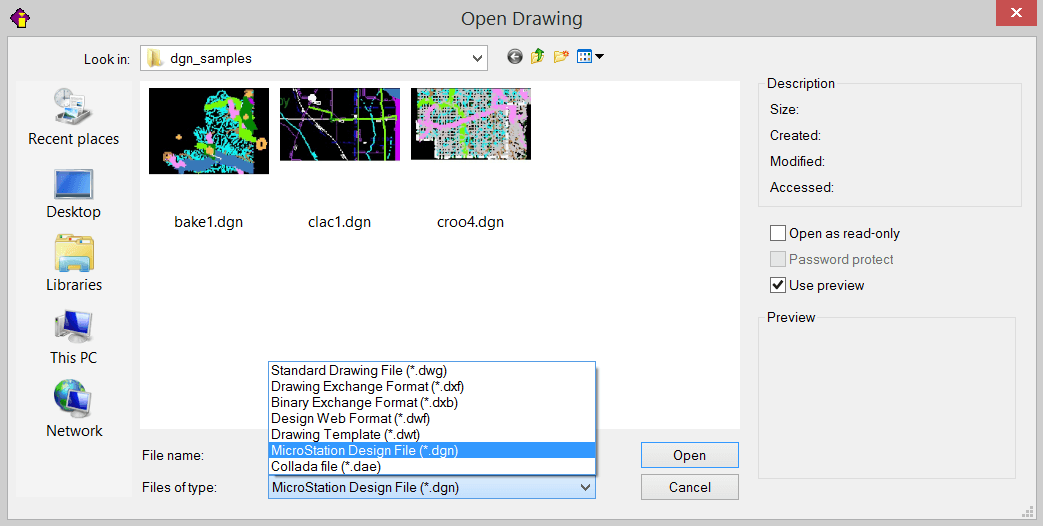 Con CMS IntelliCAD si possono importare i formati DXF, DXB, DWF, DWT e DAE , e' possibile anche importare files in formato Bentley MicroStation *.DGN e poi convertirli in  *.dwg files.