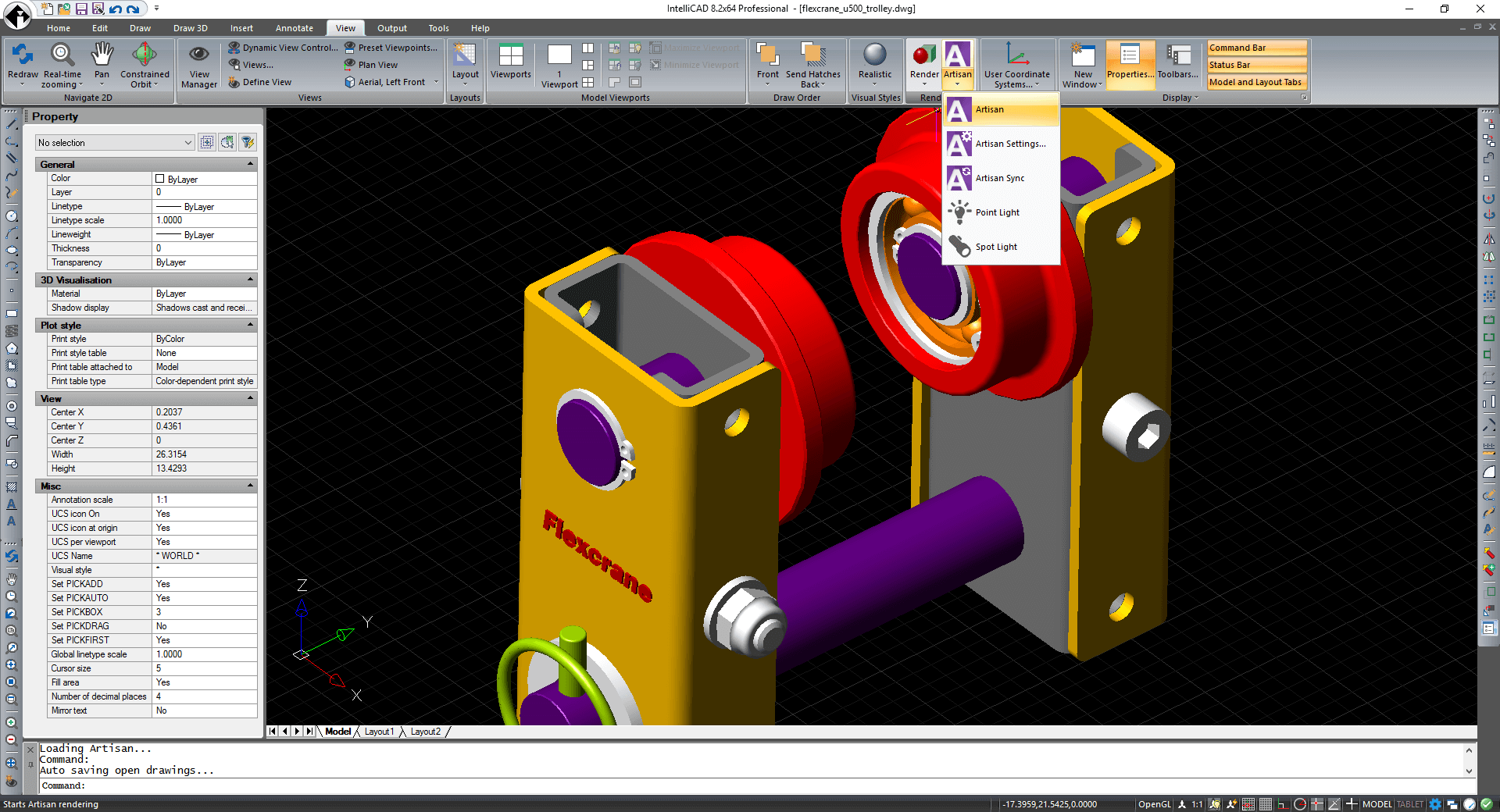 Now providing even more advanced rendering tools, CMS IntelliCAD includes an additional rendering interface with ARTISAN, which makes creating high-quality photo-realistic images from your drawings quick and easy. With a few clicks, choose from a wide range of pre-set materials and lighting setups, and your drawing is rendered. Further customization is easy too, including creation of custom realistic materials.